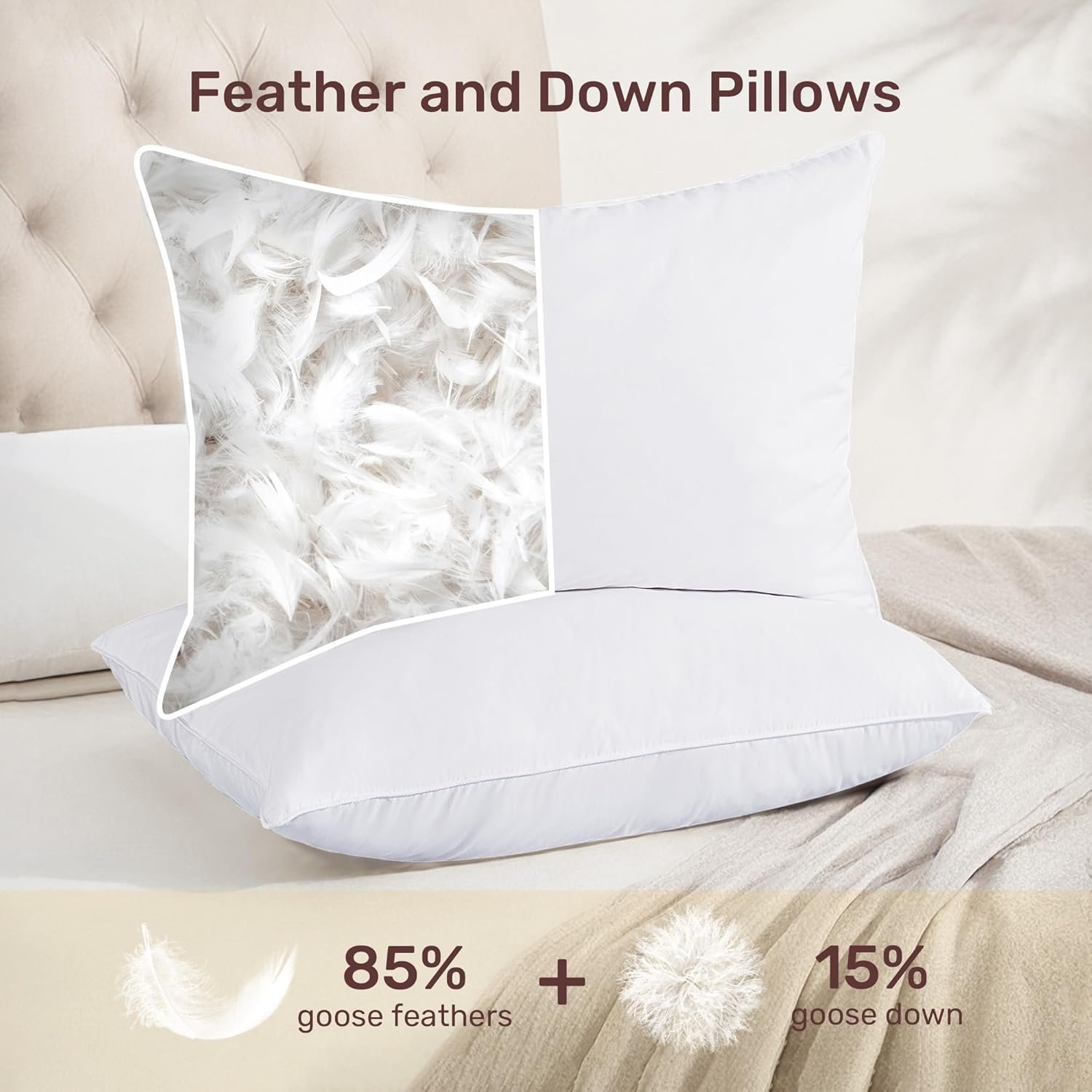 - Comfort Down Filled Bed Pillows -These fluffy bed pillows stuffing of 85% white feathers and 15% white down is carefully selected from premium and reliable raw materials which are easily bounced back to their original fluffiness.